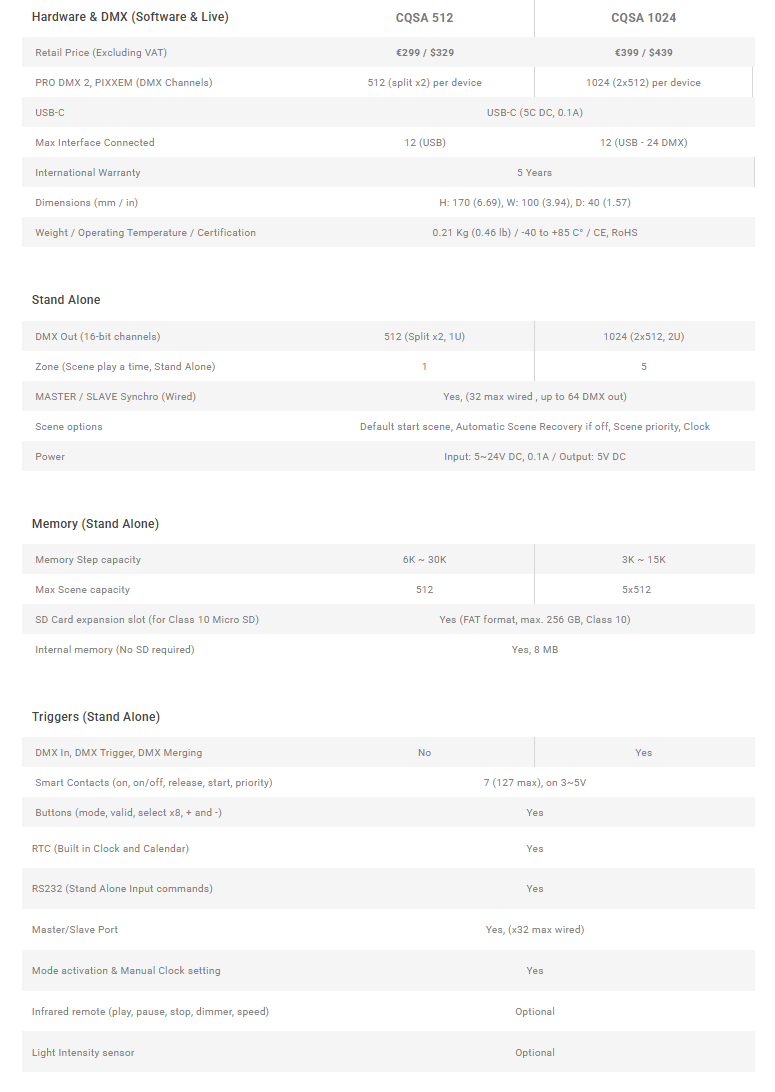 Thanks to its powerful Stand Alone mode, the CQSA is the definitively perfect DMX controller for all type of entertainment and architectural projects. It can play 1 to 5 Zones (scene) at a time without a computer. Hardware is compatible with PRO DMX 2, PIXXEM, LED Player, Pro DMX and Studio DMX software, so the interface is suitable for all Live applications and fixed installations.